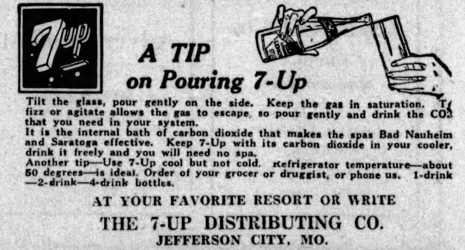 - Evans, Kenneth. “A Wide Variety of Delicious Soda Drinks Including Dr. Pepper Supplied by 7-Up Distributers.” Jefferson City Post-Tribune. March 18, 1935. p. 8.